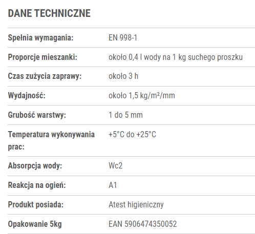 Zawartość opakowania wsypać do odmierzonej ilości wody i delikatnie wstępnie wymieszać stosując ok. 0,4 litra wody na 1 kg suchego proszku. Następnie odczekać ok. 3 minut i jeszcze raz dokładnie wymieszać do uzyskania jednolitej masy. Zaprawę nanosić na podłoże stosując czyste narzędzia ze stali nierdzewnej lub plastikowe. Po wstępnym stwardnieniu i wyschnięciu masy możliwe są drobne wykończeniowe korekty powierzchni. Zaleca się nakładanie jednorazowo warstw nie grubszych niż 5 mm. Malowanie można przeprowadzić po całkowitym stwardnieniu i wyschnięciu tynku. Warstwę świeżego tynku należy chronić przed nadmiernym wysychaniem.