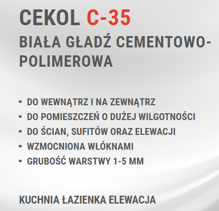 CEKOL C-35 jest zaprawą wodoodporną i mrozoodporną. Jest suchą mieszanką wysokiej jakości białego cementu, białych wypełniaczy mineralnych i środków modyfikujących, zapewniających doskonałą urabialność i przyczepność do podłoży mineralnych (np. beton, cegła, gazobeton itp.). CEKOL C-35 nie zawiera składników toksycznych, ani podatnych na żółknięcie pod wpływem światła i warunków atmosferycznych. Jest doskonałym podkładem pod farby emulsyjne, akrylowe, silikatowe, silikonowe i mineralne. Biała barwa pozwala na ograniczenie ilości wymalowań dla uzyskania pełnego efektu barwnego. CEKOL C-35 polecany jest, jako warstwa zewnętrzna w systemach ociepleń ETICS.