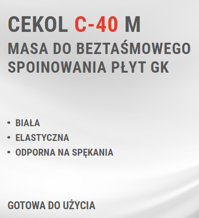 CEKOL C-40M to gotowa masa przeznaczona do ręcznego spoinowania płyt gipsowo-kartonowych bez konieczności stosowania taśmy wzmacniającej. Znajduje również zastosowanie przy uzupełnianiu pęknięć i rys powstałych na powierzchni ścian i sufitów.