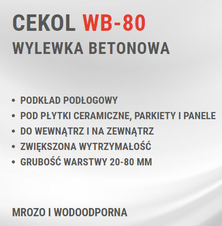 CEKOL WB-80 jest materiałem przeznaczonym do wykonywania podkładu podłogowego na bazie cementu do stosowania wewnątrz i na zewnątrz obiektów budowlanych. Może stanowić podkład pod wykładziny ceramiczne, parkiety, panele i wykładziny PVC.